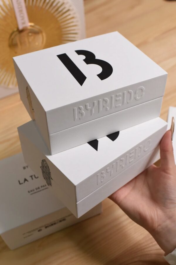 This embossed rigid box is crafted from premium specialty paper, combining minimalist aesthetics with tactile depth to elevate luxury brand packaging.