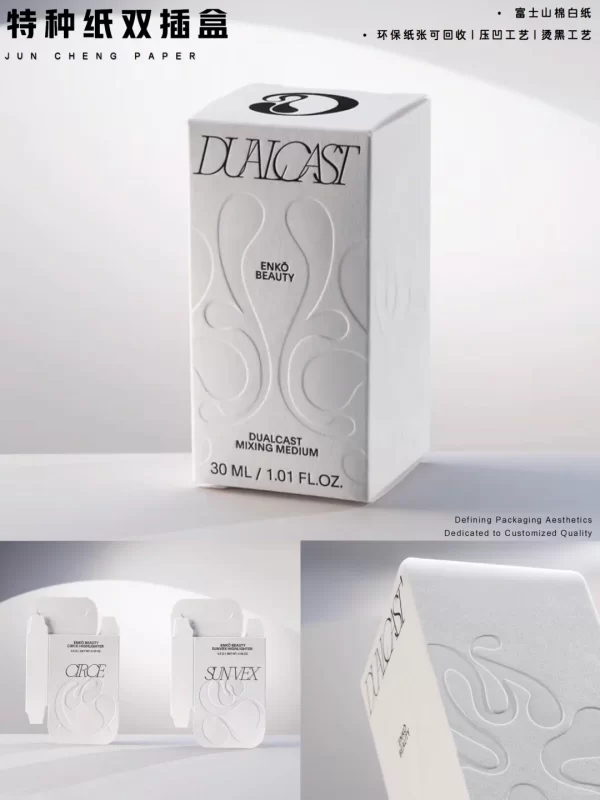 This specialty paper double tuck box combines a clean folding structure with refined embossing details, delivering a minimal yet premium packaging solution for modern brands.